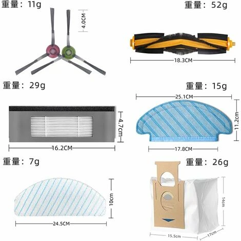 L’ensemble contient (1 brosse principale + 6 paires de brosses latérales + 3 filtres + 5 chiffons + 3 serviettes T9)